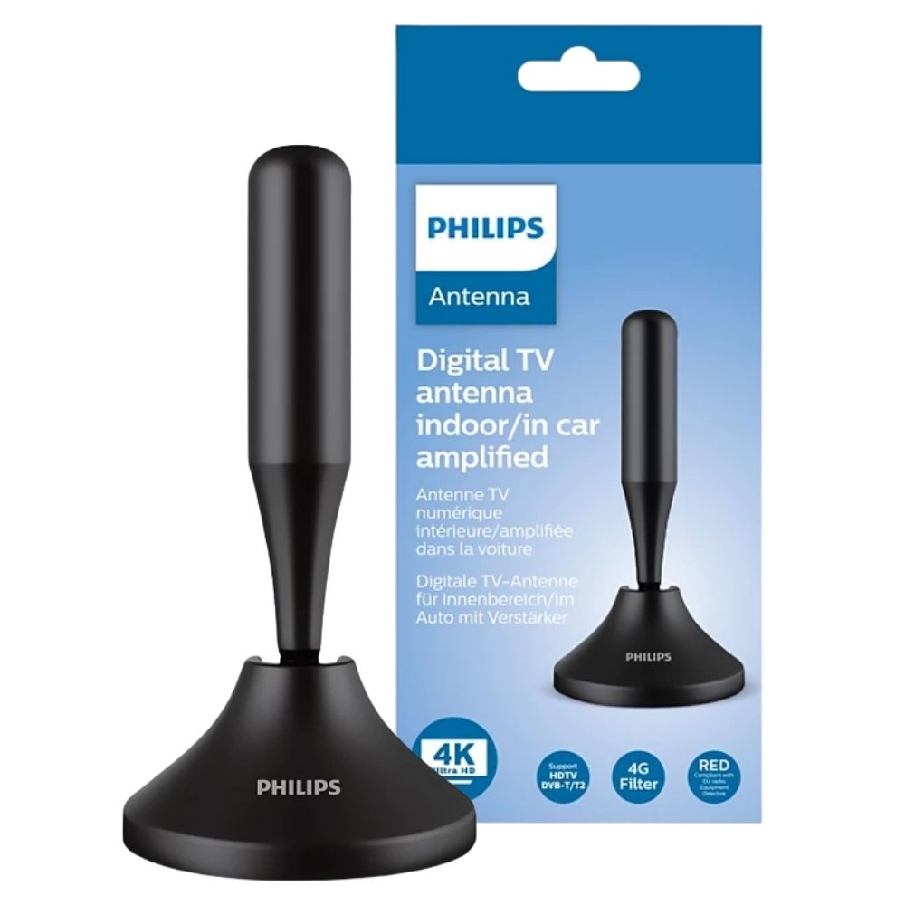 Philips SDV5300/12 to wzmacniana antena pokojowa z magnetyczną podstawą, wspierająca odbiór sygnału na zakresach UHF, VHF, FM oraz HDTV. Idealna do odbioru cyfrowych kanałów i radia dzięki wzmacniaczowi 18 dB oraz filtrowi 4G, redukującemu zakłócenia