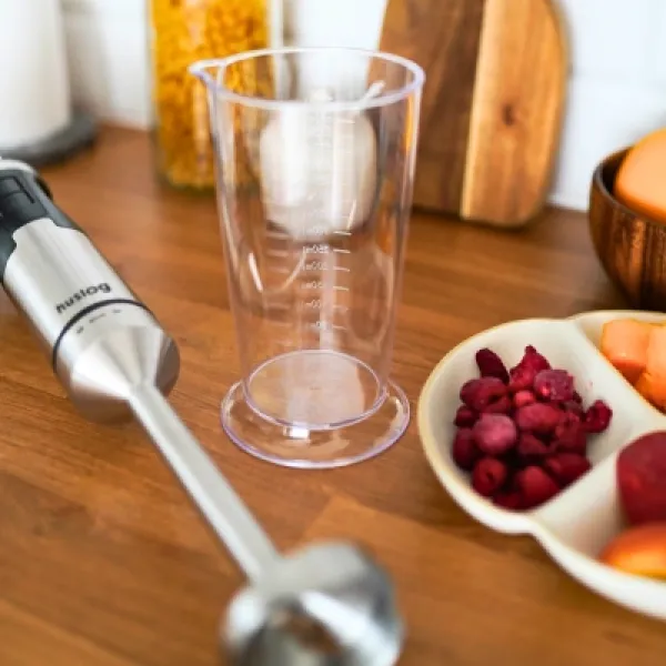 W komplecie znajdziesz końcówkę miksującą, końcówkę siekającą, pojemnik z miarką oraz pojemnik do siekania. Każdy element łatwo się czyści i montuje, co pozwala zachować higienę i wygodę użytkowania.