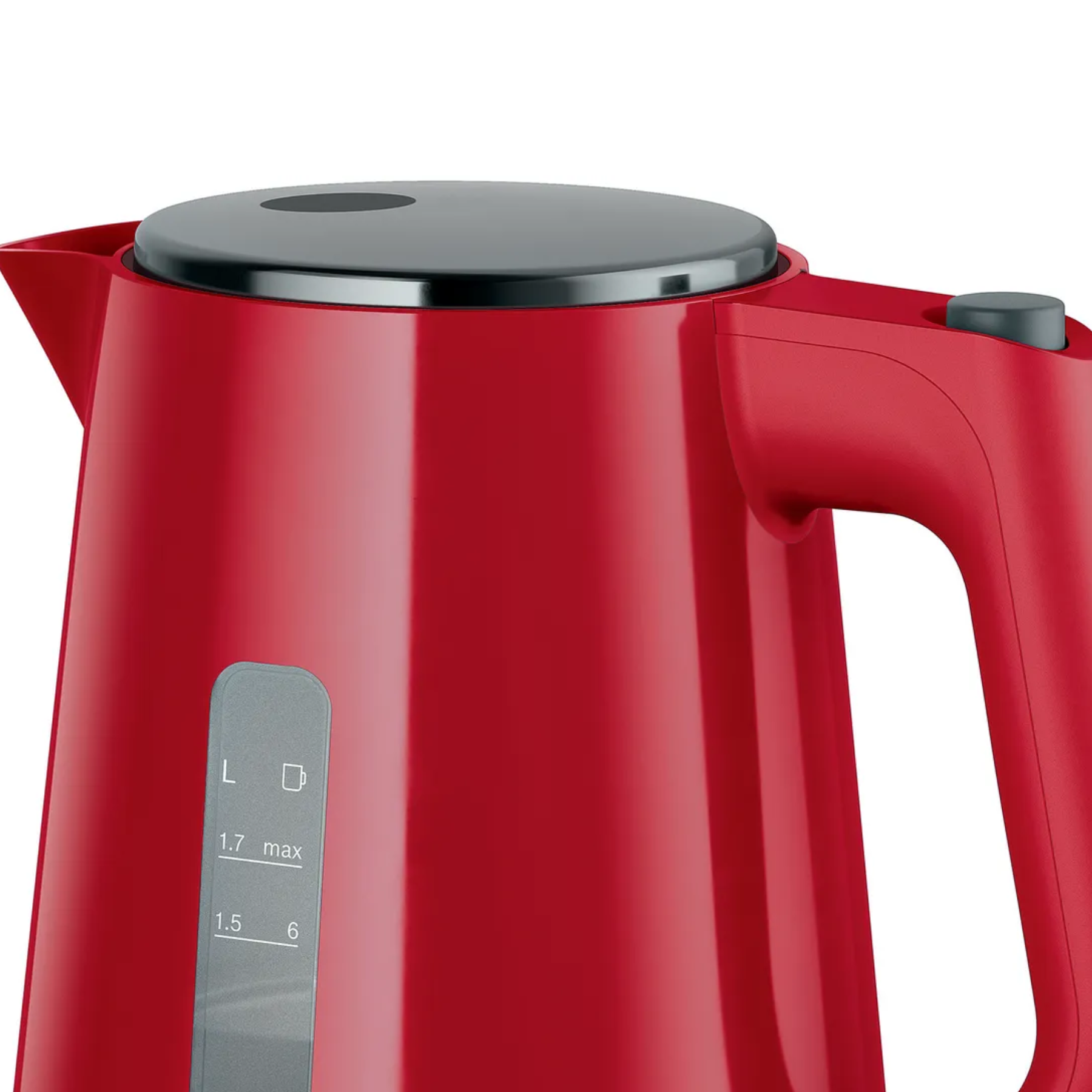 Stylowy wygląd w głębokiej czerwieni oraz solidna budowa z tworzywa sztucznego o wewnętrznej stalowej wyściółce nadają czajnikowi elegancji i trwałości. Pokrywa otwierana przyciskiem ułatwia napełnianie wodą — szybko i bez wysiłku.