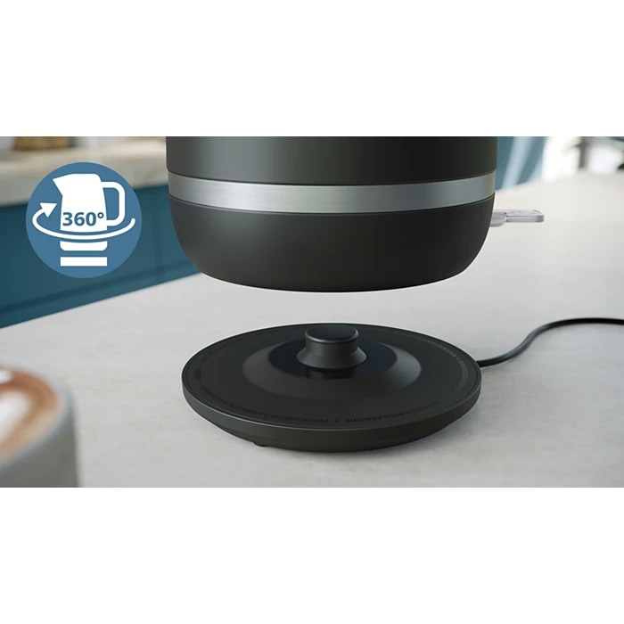 Obrotowa podstawa 360° umożliwia łatwe ustawienie czajnika w dowolnym kierunku. Sprężynowa pokrywa otwierana jednym przyciskiem oraz wskaźnik poziomu wody zwiększają komfort użytkowania. Dodatkowo, miejsce na nawinięcie przewodu pozwala na utrzymanie porządku na blacie kuchennym.