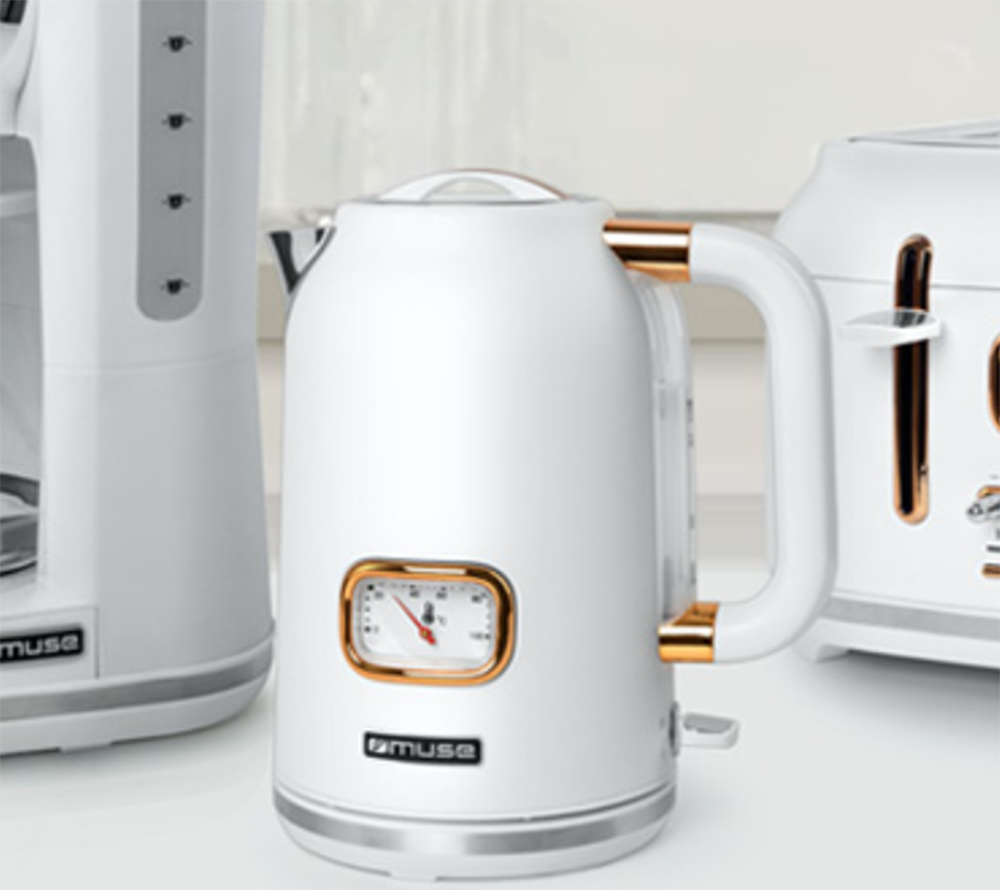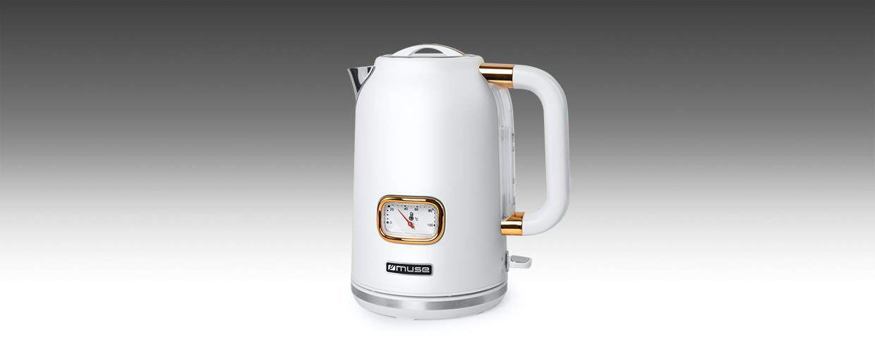 Czajnik Muse MS-030 wyróżnia się oryginalnym designem w stylu subtelnego Retro, który doskonale komponuje się z różnymi stylami kuchennymi. Biały korpus, ze złotymi elementami oraz oryginalny termometr tworzą oryginalny, elegancki wygląd.