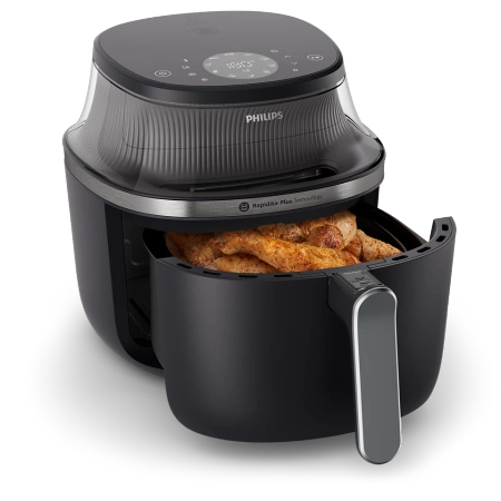 Opatentowana technologia RapidAir Plus z unikalną konstrukcją w kształcie gwiazdy cyrkuluje gorące powietrze wokół i przez żywność, zapewniając szybsze i bardziej równomierne gotowanie. Dzięki temu Twoje dania będą idealnie przyrządzone zarówno wewnątrz, jak i na zewnątrz.