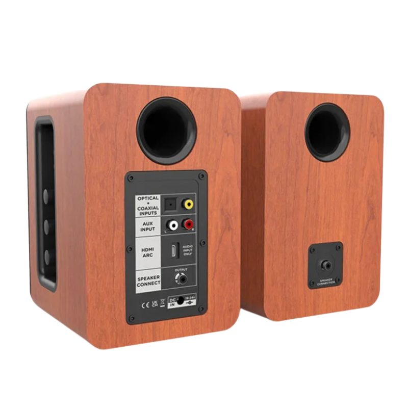 Solidna, drewniana obudowa: W całości wykonana z płyty MDF, z elegancką powłoką z forniru PVC i zaokrąglonymi narożnikami – to nie tylko styl, ale też lepsza jakość akustyczna.