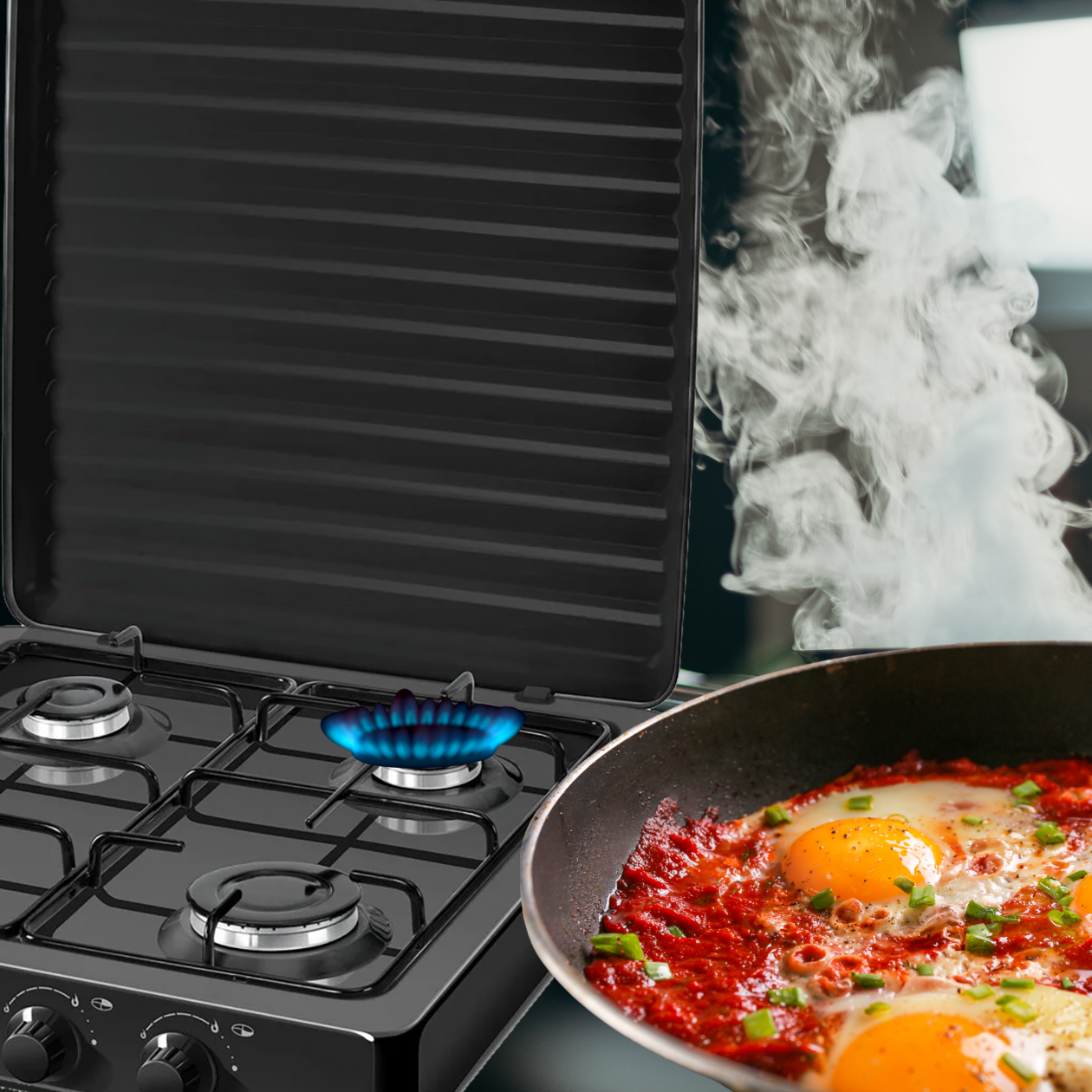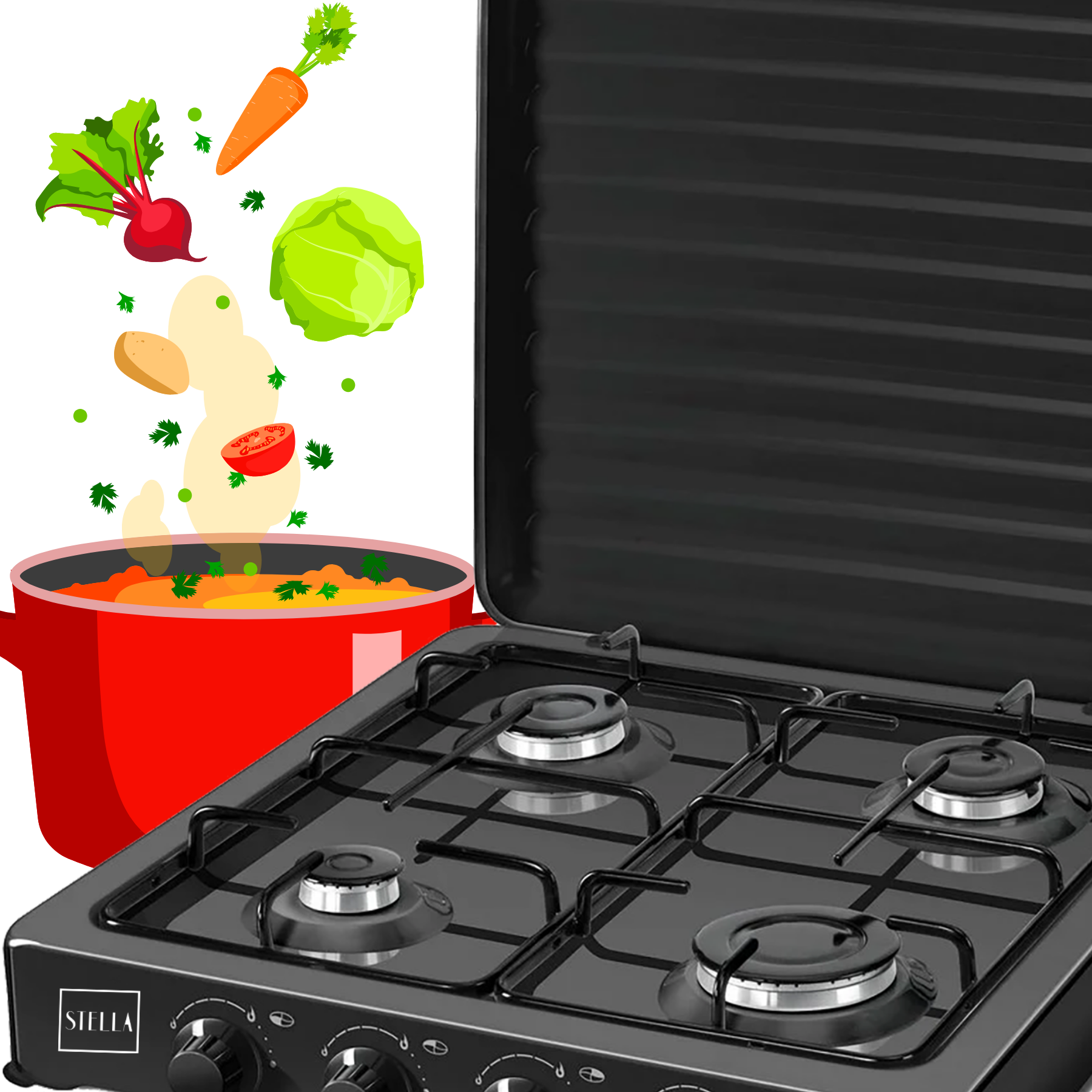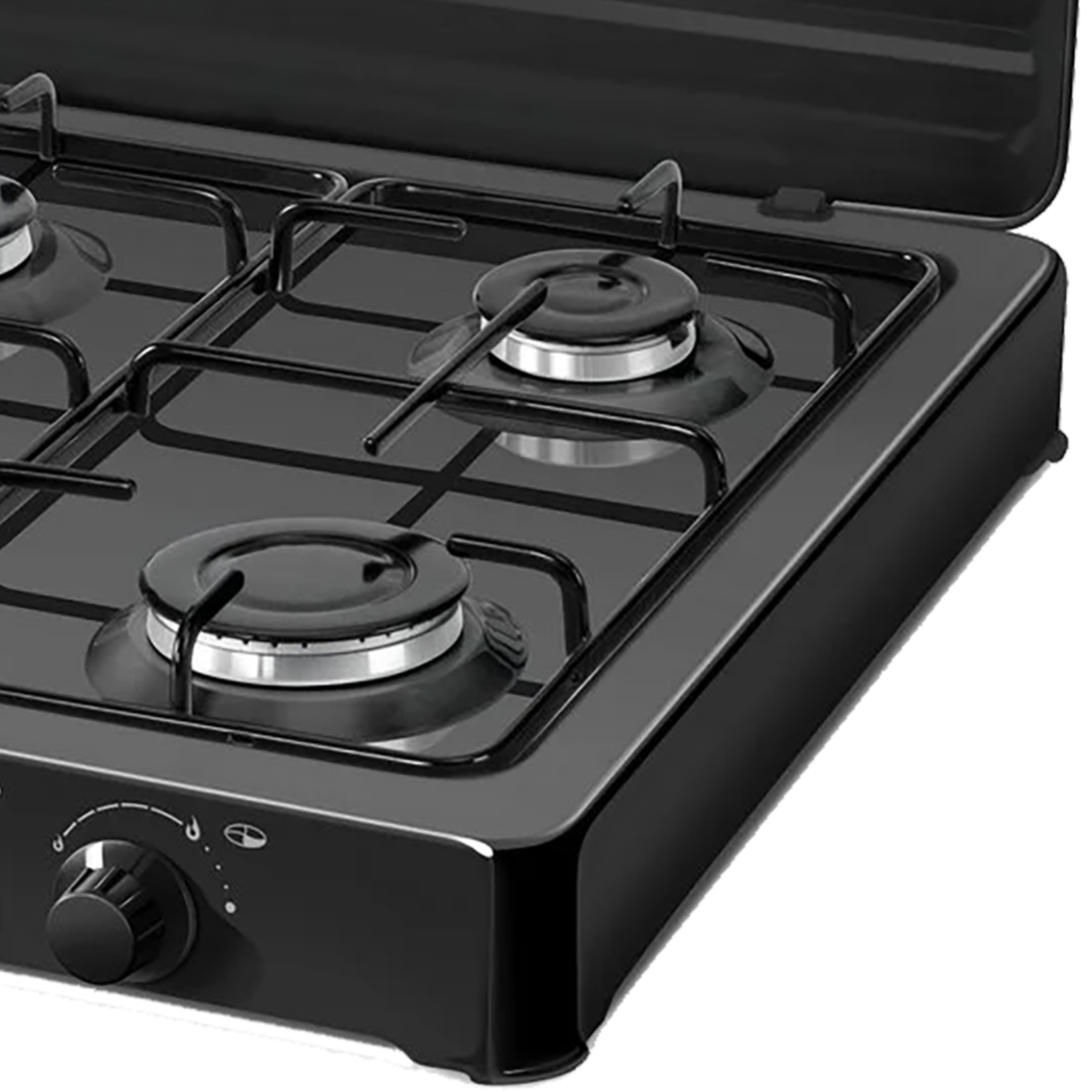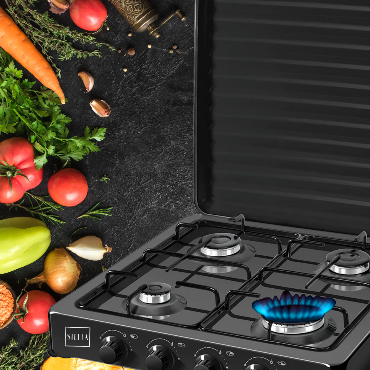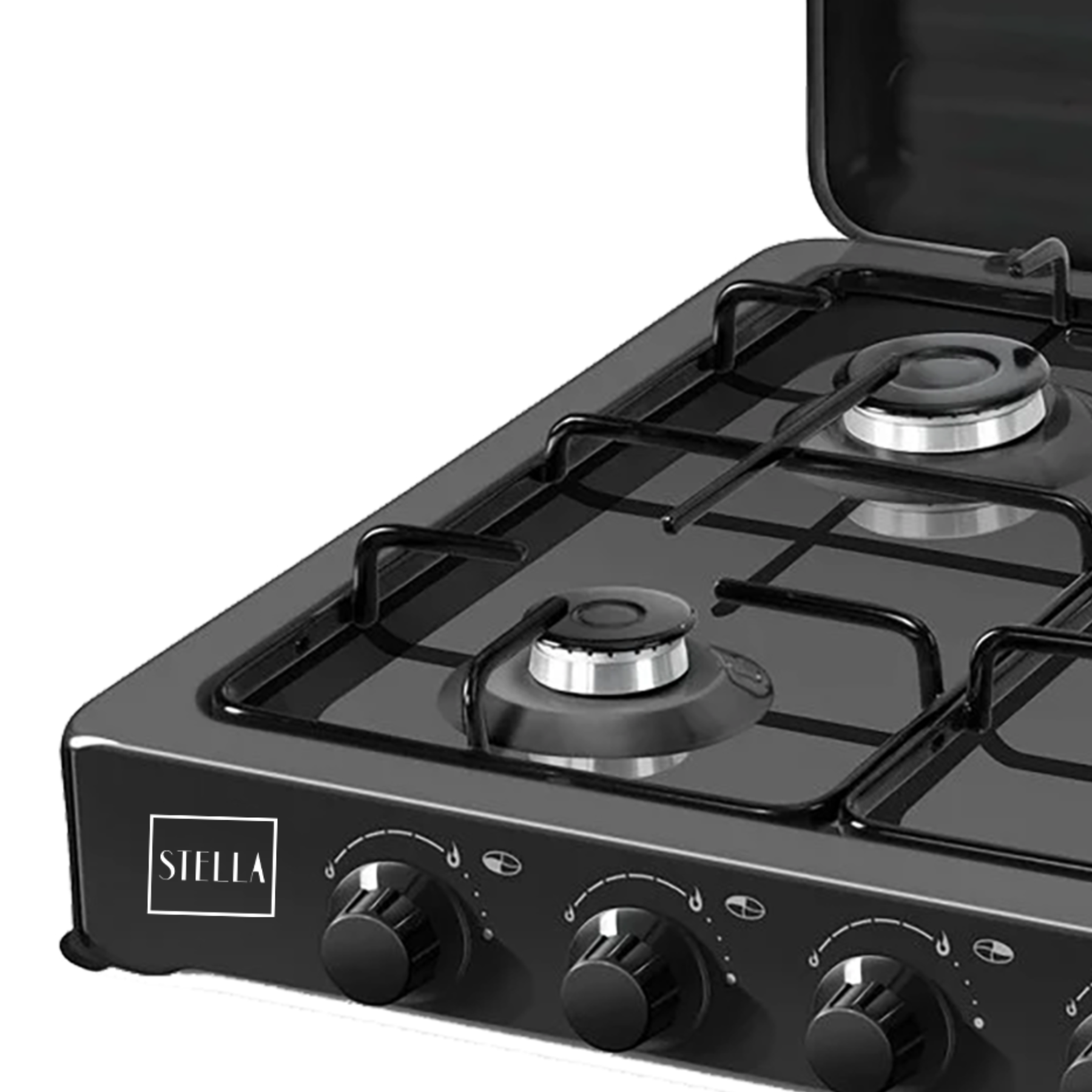 Wolnostojąca płyta gazowa  STELLA STKGC-04 w czarnym kolorze z 4 palnikami, emaliowanym rusztem i metalową pokrywą.