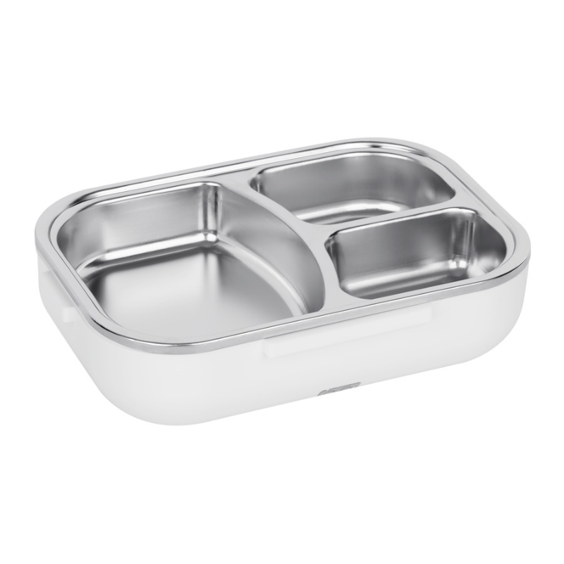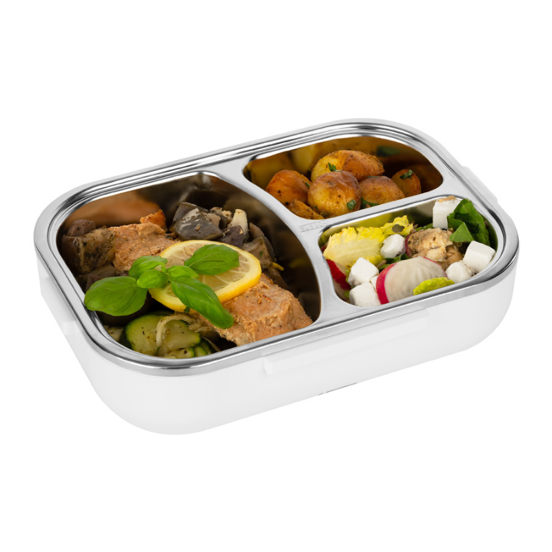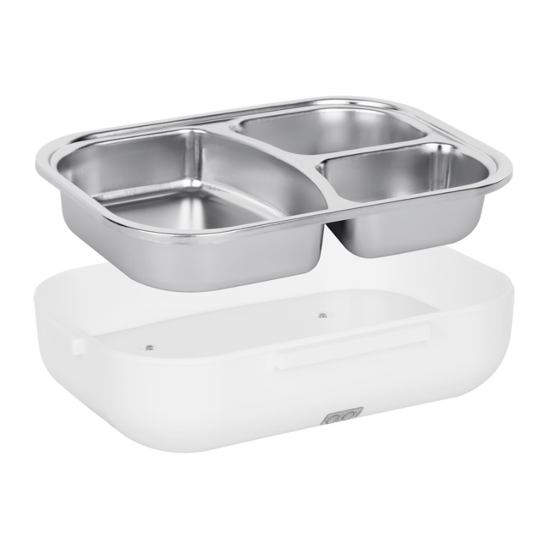 Lunch box wyposażony jest w 3‑komorowy pojemnik, schowek na sztućce, torbę termiczną, kable zasilające oraz składaną rączkę. To kompletne rozwiązanie dla każdego, kto ceni wygodę i ciepły posiłek niezależnie od miejsca.