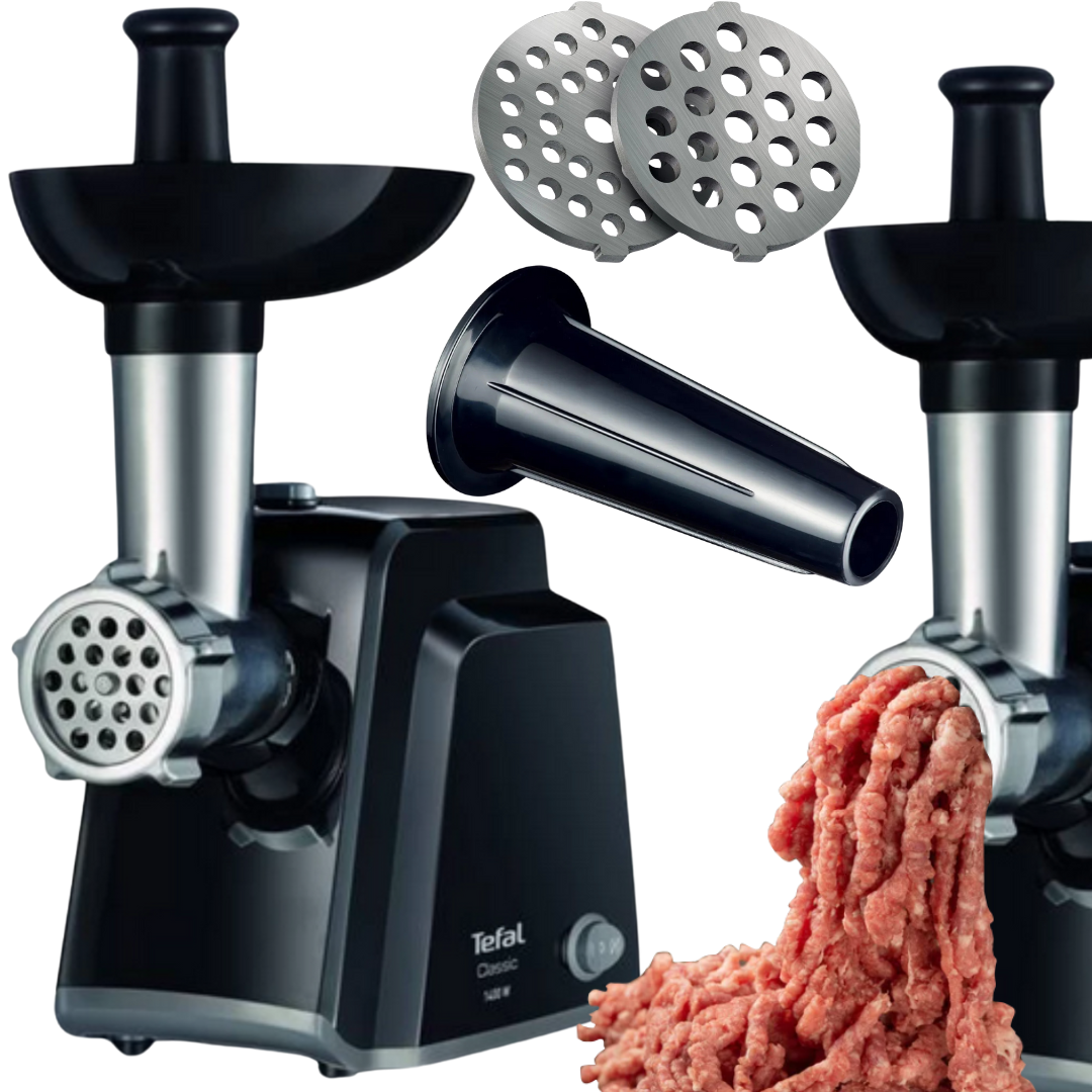 Maszynka do mięsa Tefal NE10583 jest wyposażona w dwa sitka do mięsa o różnej grubości oraz nasadkę masarską, która pozwala na przygotowanie domowych kiełbas. Wszystko, czego potrzebujesz, jest dostępne w jednym urządzeniu.