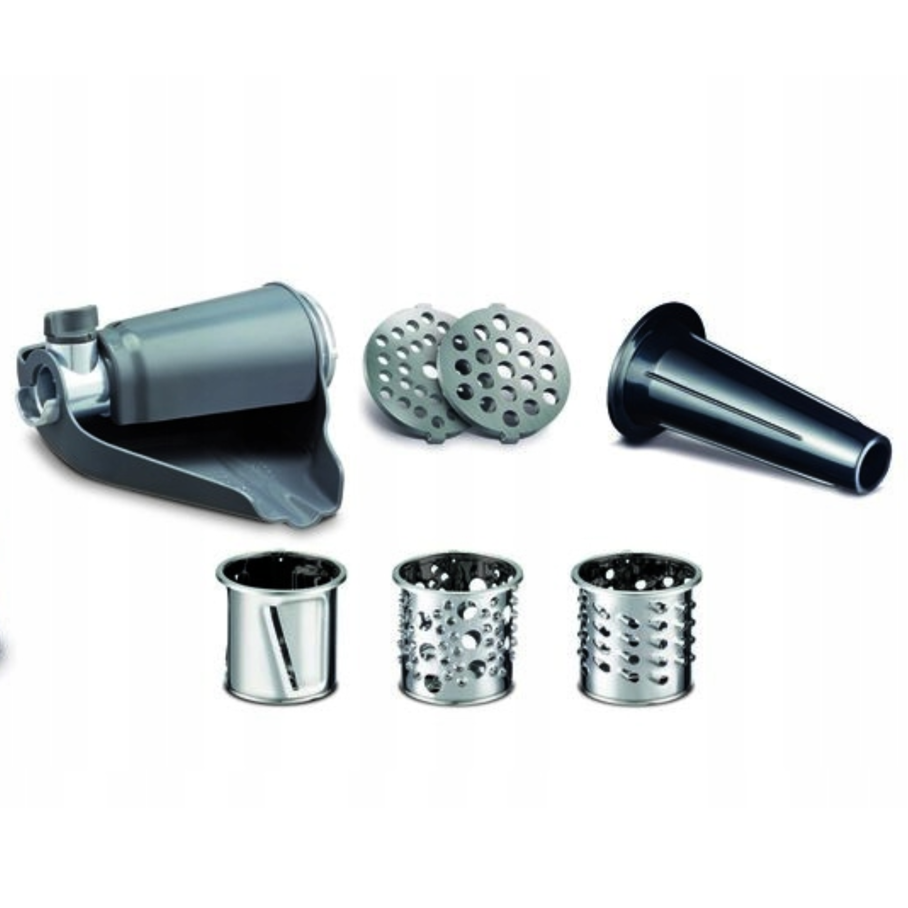 - Załączone wyposażenie: 2 sitka do mielenia, 3 nasadki do szatkowania, nasadka masarska, wyciskarka do miękkich owoców