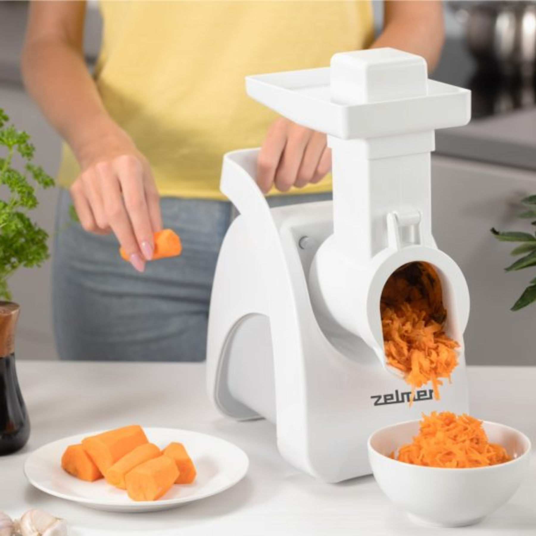 Urządzenie zostało wyposażone w szatkownicę z 4 bębnami trącymi, które umożliwiają przygotowanie wiórków, słupków, plastrów oraz tarkowanie ziemniaków. Dzięki temu maszynka ZMM9802B pełni funkcję wielofunkcyjnego urządzenia kuchennego.