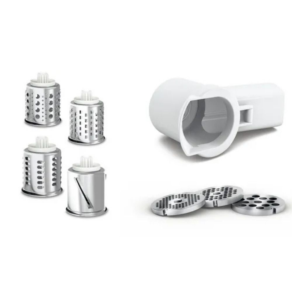 W zestawie znajdują się trzy sitka o różnej grubości oczek (2,7 mm, 4 mm, 8 mm), nasadki do wyrobu kiełbas i kebbe oraz szatkownica bębnowa. Dzięki temu urządzenie sprawdza się nie tylko jako maszynka do mięsa, ale również jako pomoc przy tarciu i krojeniu warzyw, serów czy owoców.