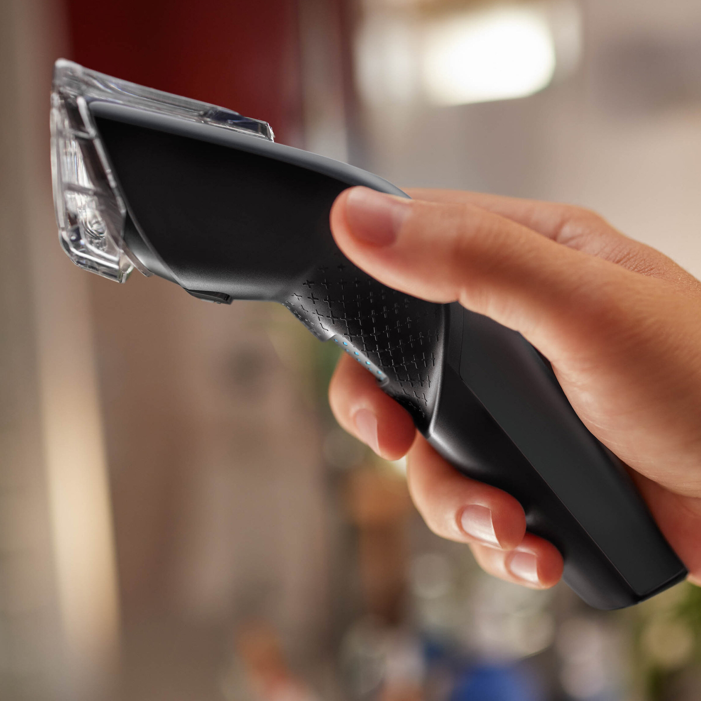 Specjalnie zaprojektowany ergonomiczny uchwyt zapewnia pewny chwyt i wygodę podczas strzyżenia. Teksturowana powierzchnia zapobiega ślizganiu się maszynki w dłoni.
