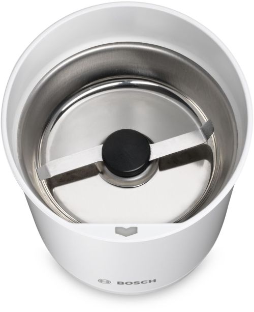 Wyposażony w silnik o mocy 180 W, młynek BOSCH TSM6A011W pozwala na szybkie mielenie do 75 gramów ziaren kawy jednorazowo, co odpowiada przygotowaniu około 10 filiżanek napoju. Dwuskrzydłowy nóż ze stali nierdzewnej zapewnia równomierne mielenie, co przekłada się na doskonały smak i aromat kawy.