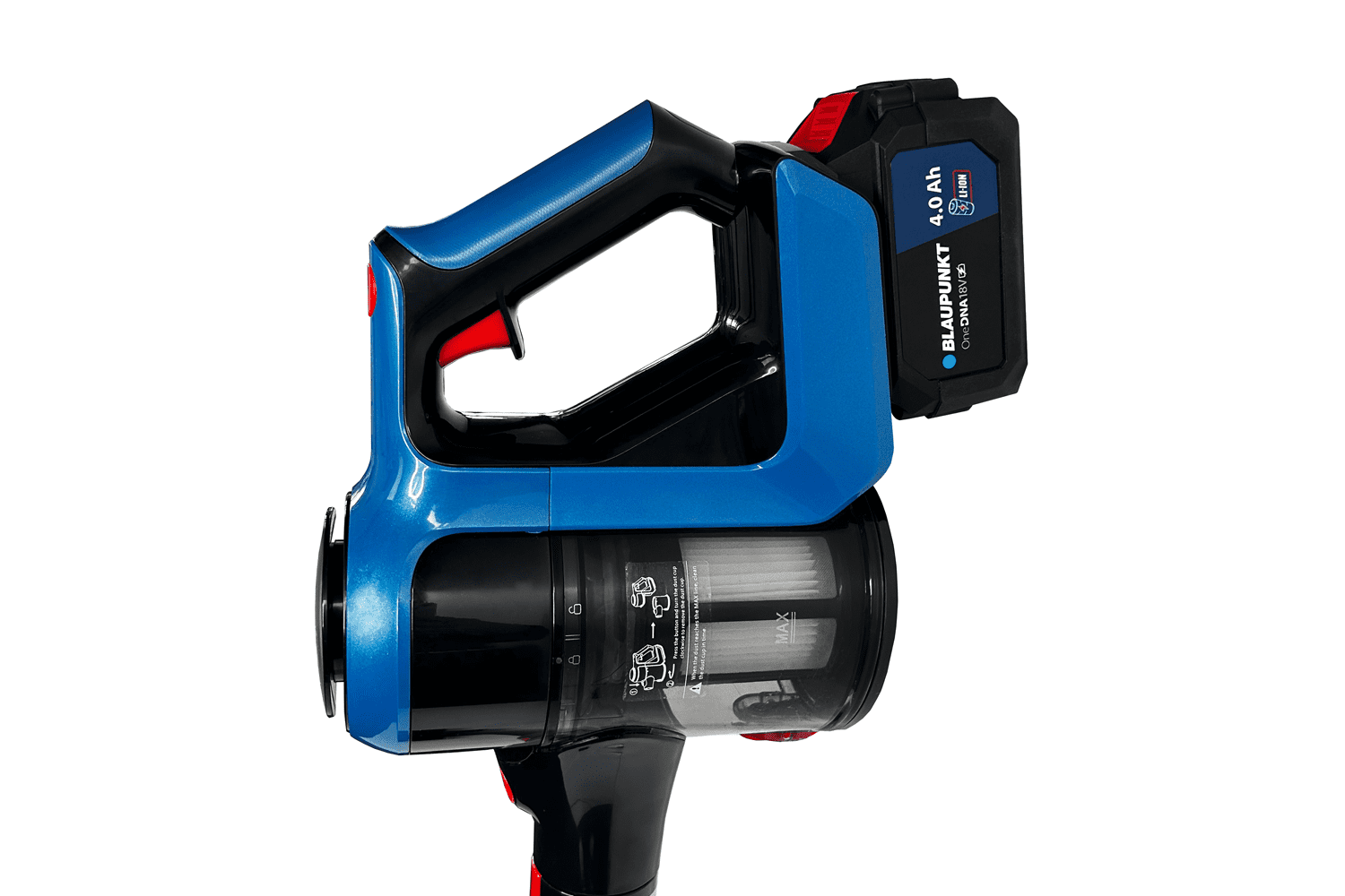 Dzięki akumulatorowi Li-Ion 18 V odkurzacz działa bez kabla, dając pełną swobodę poruszania się po całym domu. W zestawie znajduje się akumulator 4,0 Ah oraz szybka ładowarka, dzięki czemu urządzenie jest zawsze gotowe do pracy.