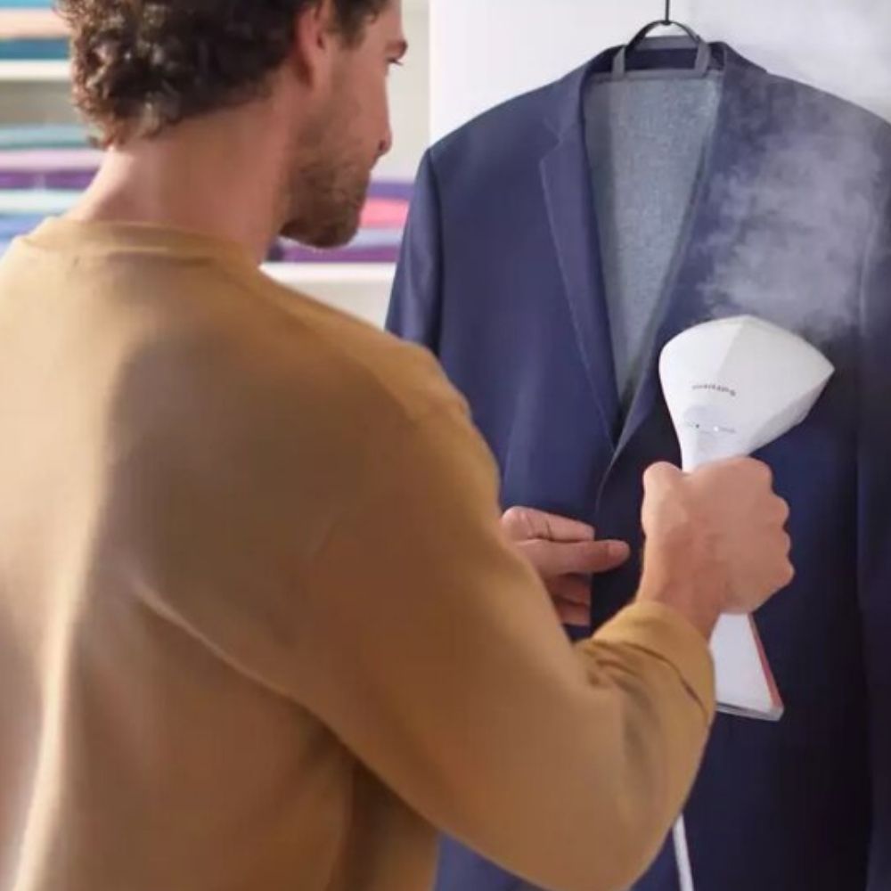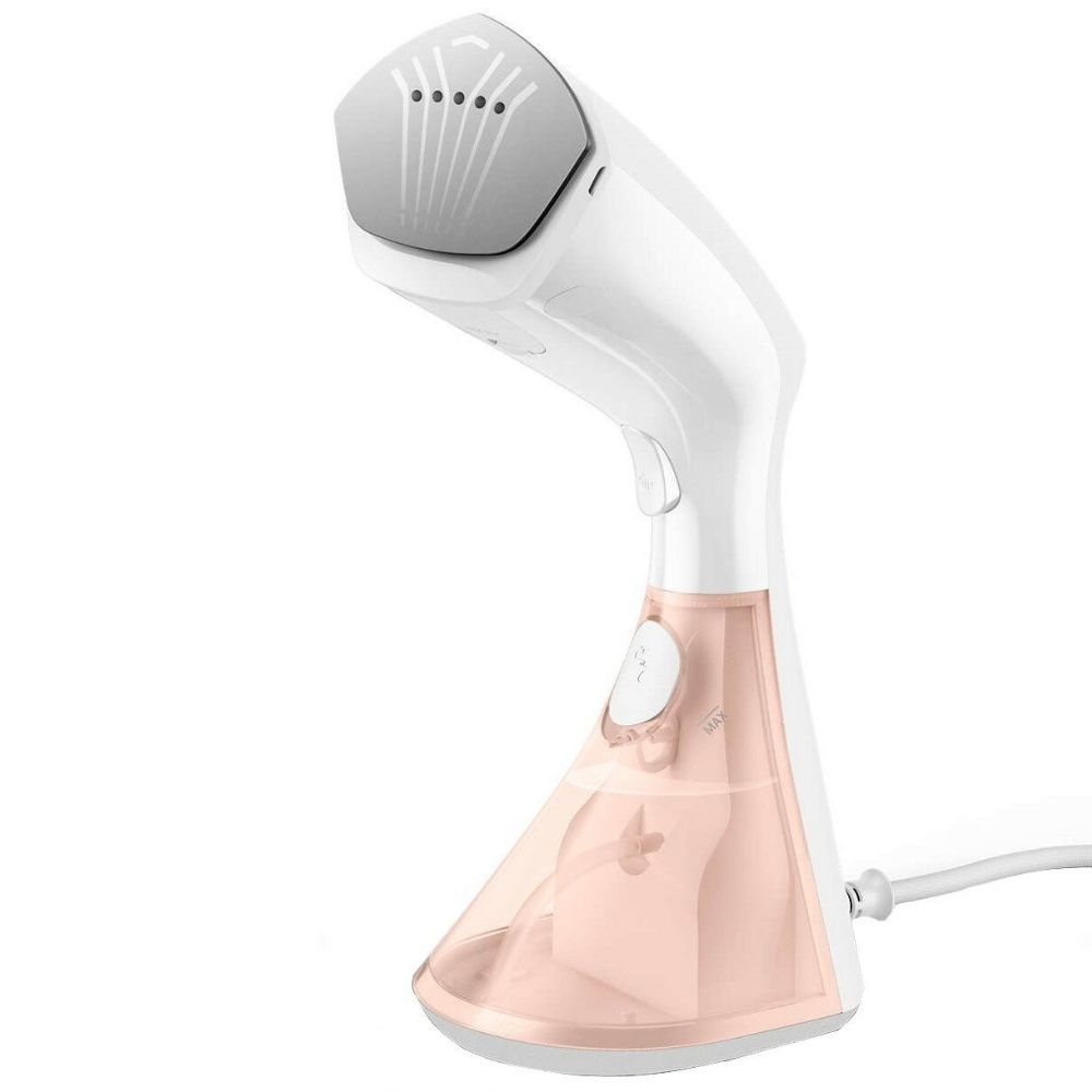 Zbiornik o pojemności 230 ml umożliwia 12 minut ciągłego parowania. Funkcja De‑Calc chroni przed osadzaniem kamienia, a blokada kapania zapobiega śladom na ubraniach