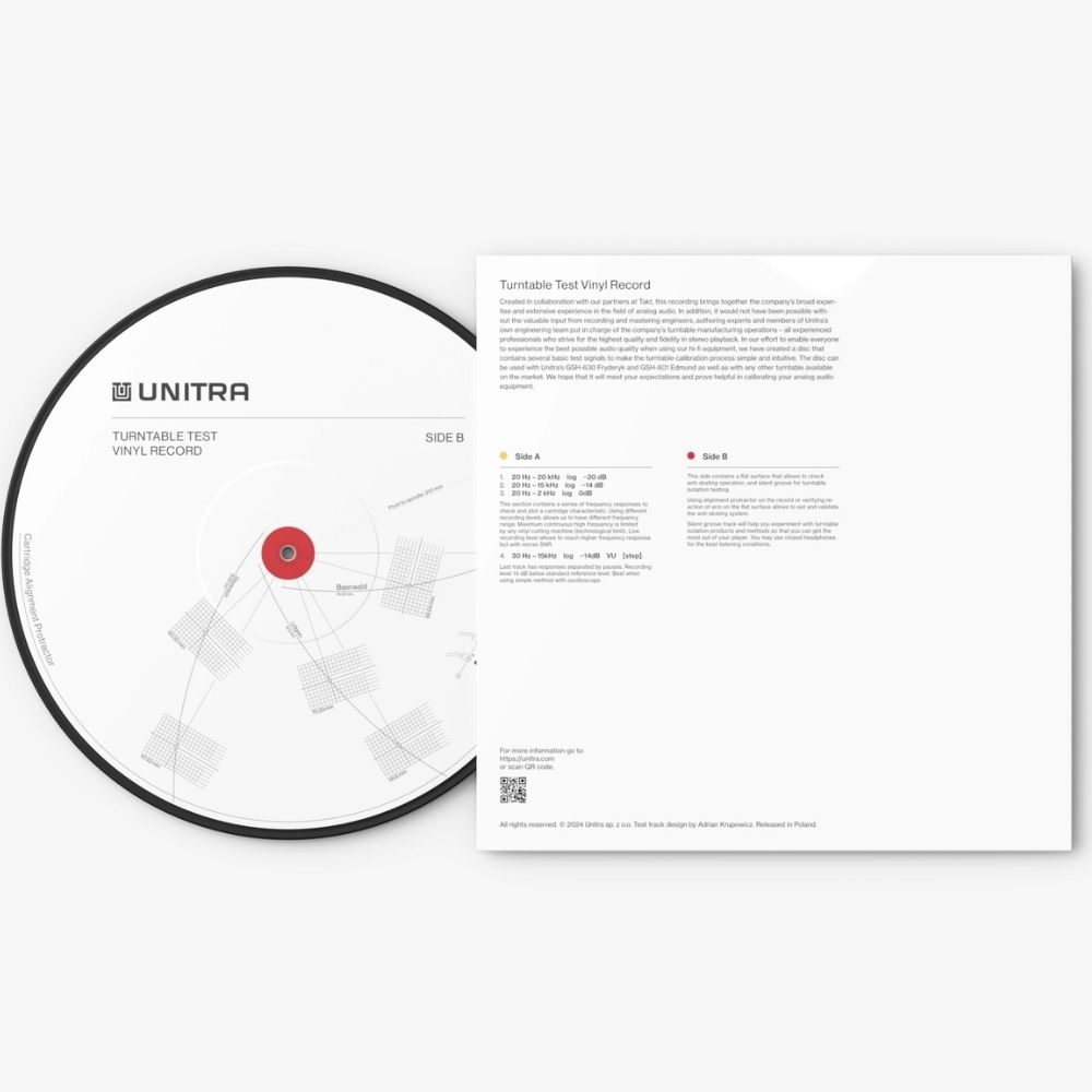 Unitra WT‑1 Standard Edition to profesjonalna płyta testowa 12″ (180 g) zaprojektowana we współpracy z polskimi inżynierami audio dla precyzyjnego testowania i kalibracji gramofonów w warunkach domowych