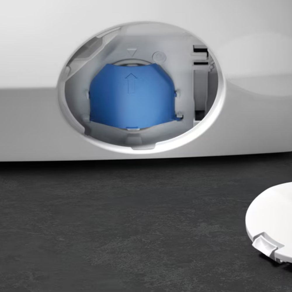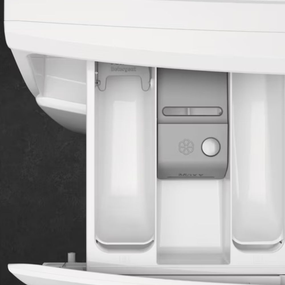 Wymiary pralki to 59,7 × 63,1 × 84,7 cm (S×G×W), głębokość z elementami wystającymi – 66 cm. Biały korpus i czarne drzwi dobrze komponują się z nowoczesnymi wnętrzami.