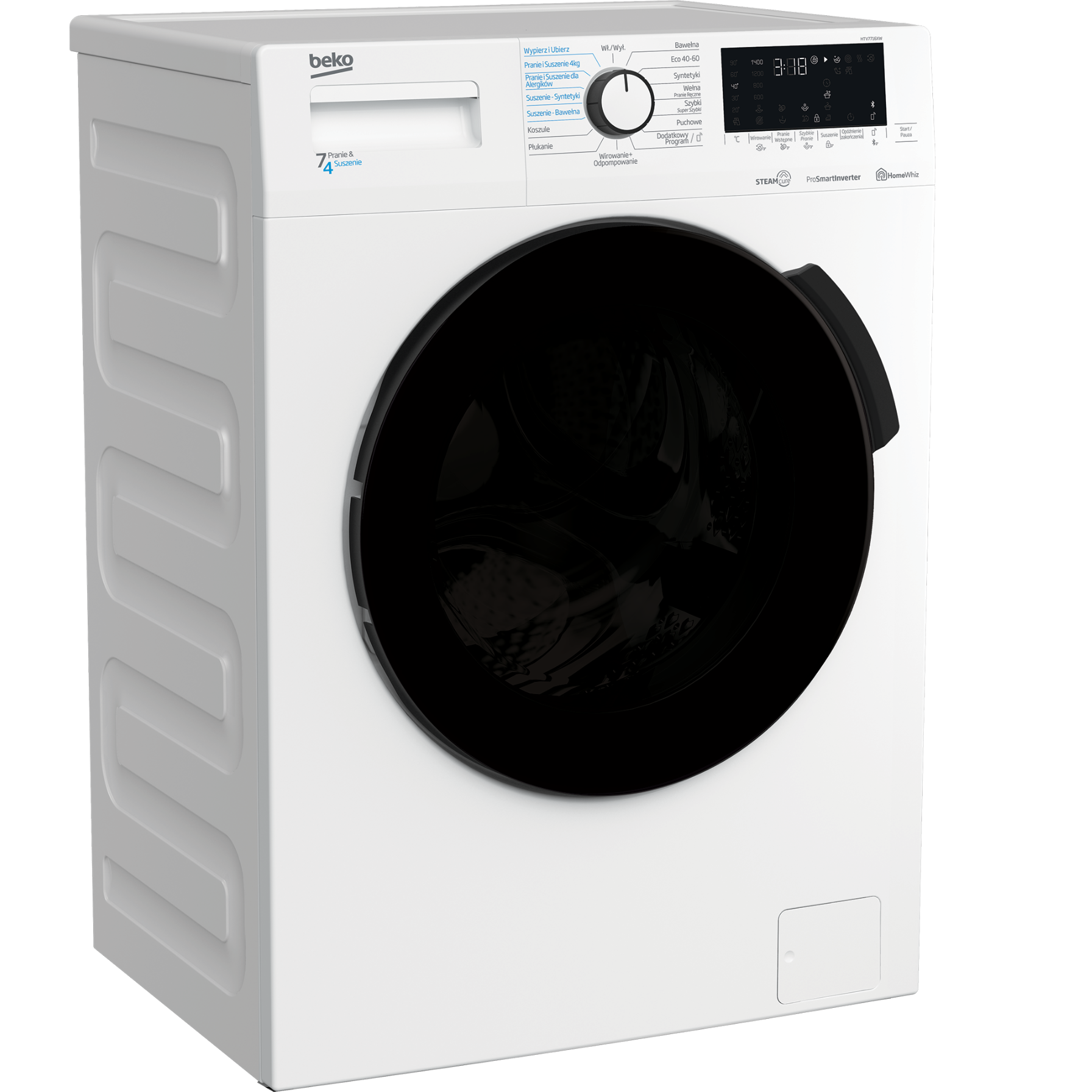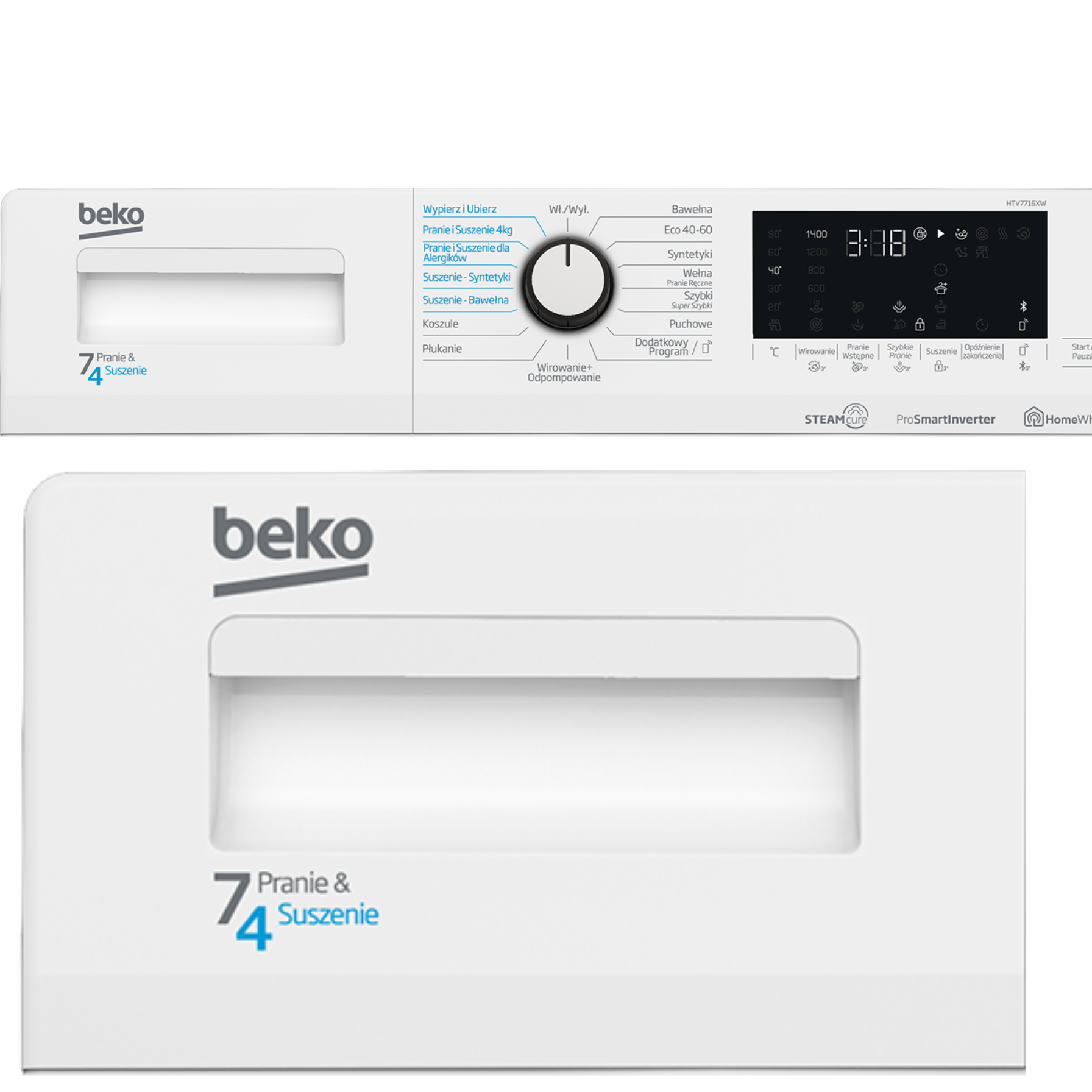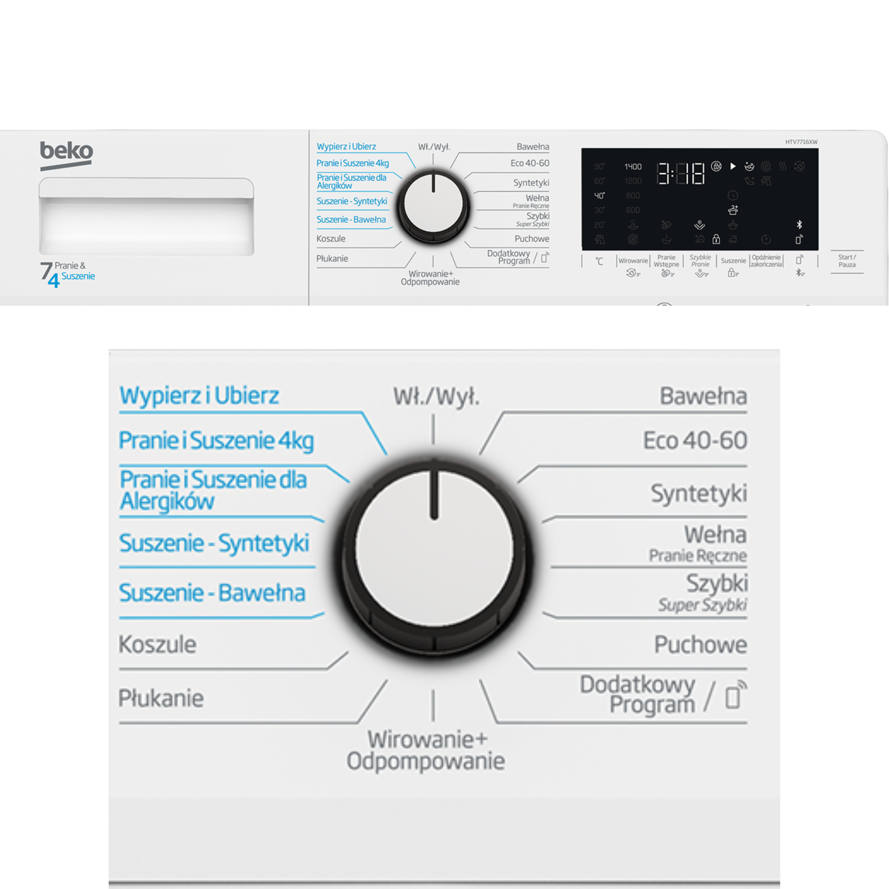 Beko HTV7716XW to kompaktowa pralko-suszarka (głębokość ~45 cm), idealna do mieszkań i mniejszych łazienek. Łączy funkcje prania i suszenia w jednym urządzeniu, oszczędzając miejsce – i czas – bez kompromisu dla jakości prania i wygody.
