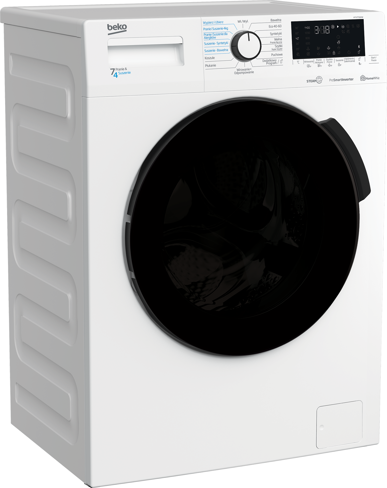 Dzięki ProSmart™ hałas podczas prania wynosi tylko 56 dB, a suszenia 64 dB, co czyni model wyjątkowo spokojnym w użytkowaniu.