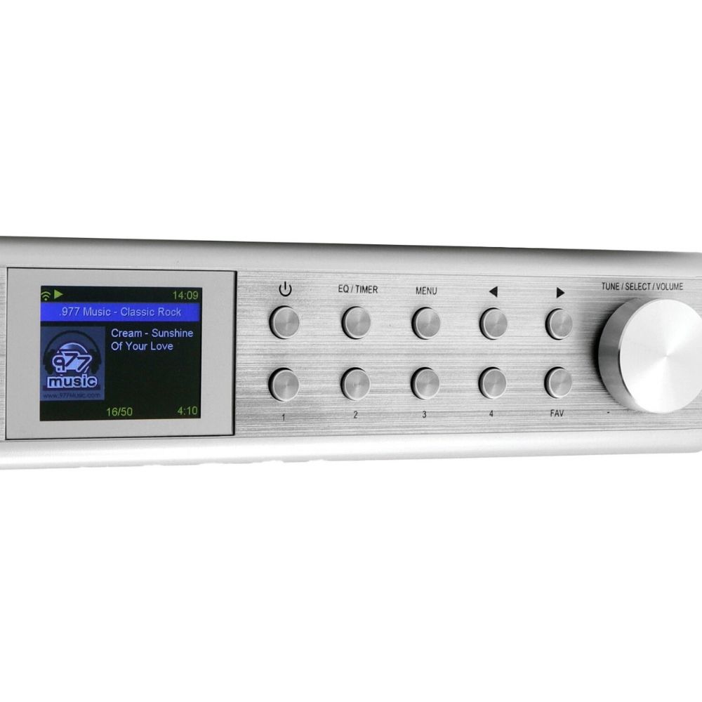 Model obsługuje internetowe radio (ponad 26 000 stacji), DAB+ oraz FM‑RDS, co pozwala korzystać z ulubionych stacji w najwyższej jakości.