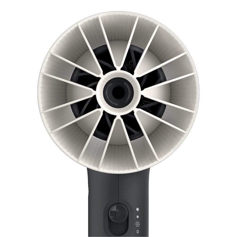 Dyfuzor zwiększający objętość Rozprowadza powietrze równomiernie, podnosząc włosy u nasady i redukując puszenie. Miękkie wypustki masują skórę głowy, podkreślając kształt loków i fal.