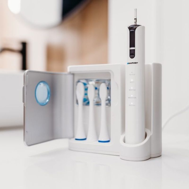 Stacja dokująca wyposażona w lampę UV eliminuje aż 99,9% bakterii i wirusów znajdujących się na końcówkach szczoteczki. To funkcja, która szczególnie sprawdzi się w przypadku rodzin oraz osób z wrażliwymi dziąsłami.