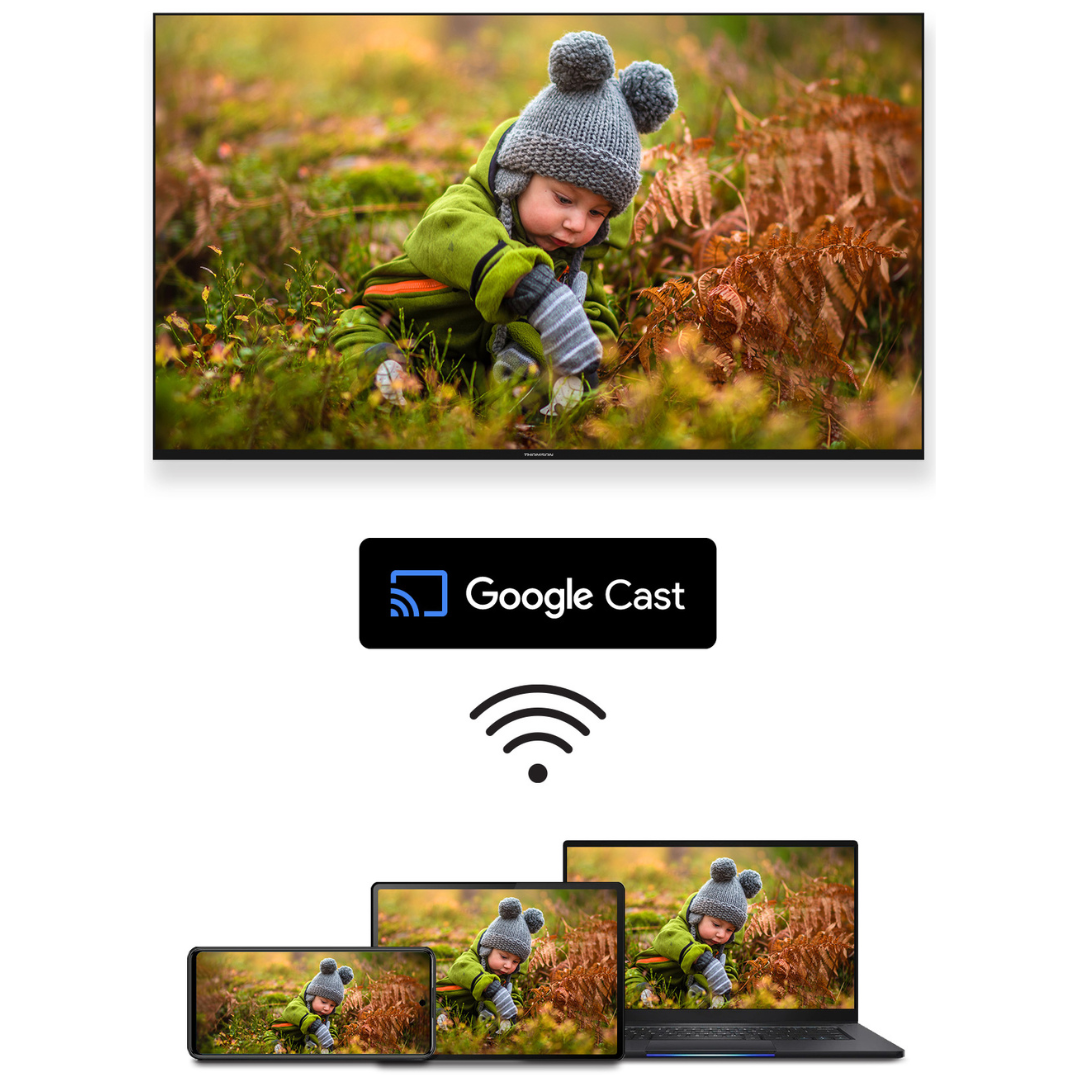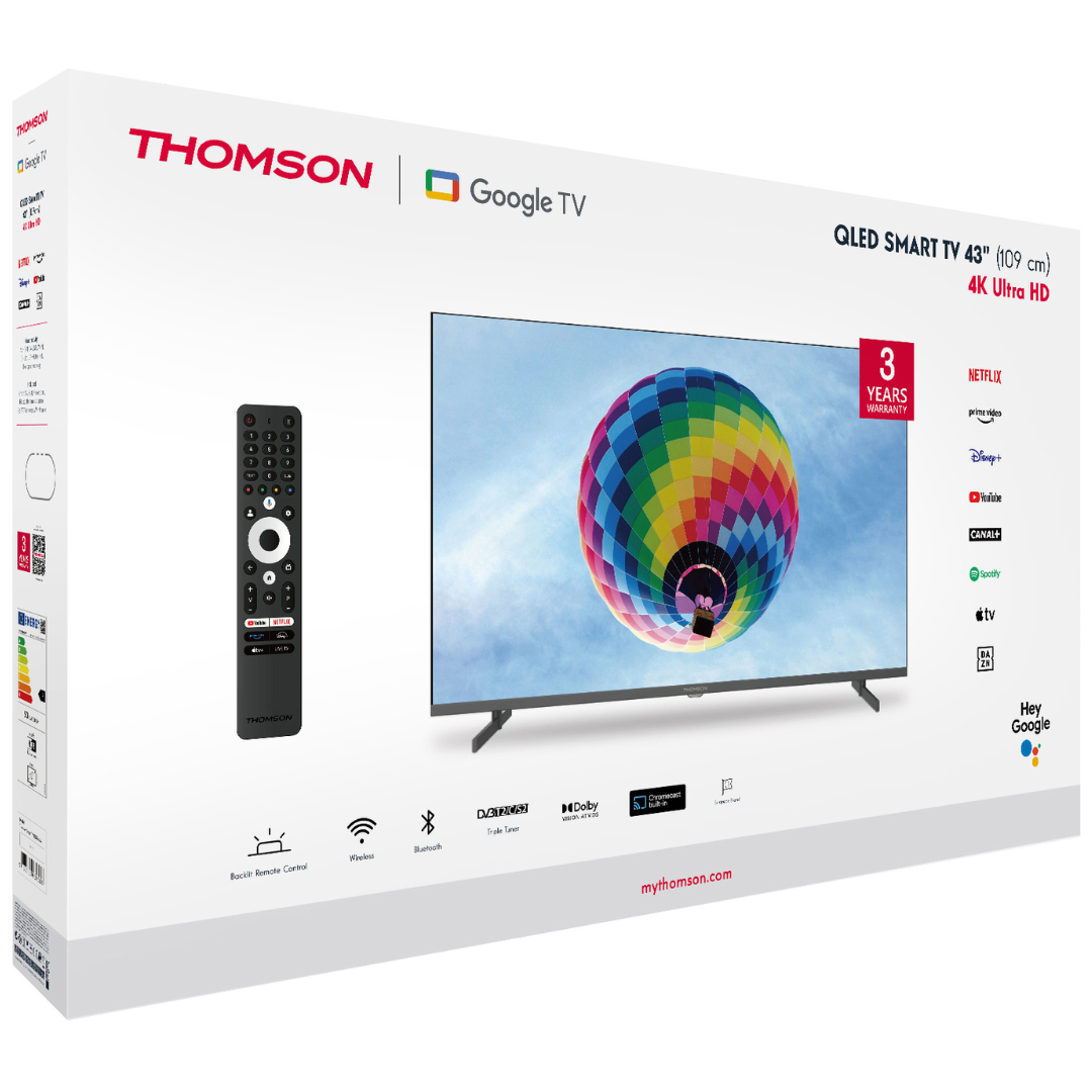 Thomson 43QG4S14 to inteligentny telewizor z systemem Google TV™, oferujący łatwy dostęp do popularnych aplikacji, takich jak Netflix, YouTube, Prime Video, czy Disney+. Dzięki wbudowanemu Asystentowi Google możesz sterować urządzeniem za pomocą głosu, co zapewnia wygodę użytkowania.