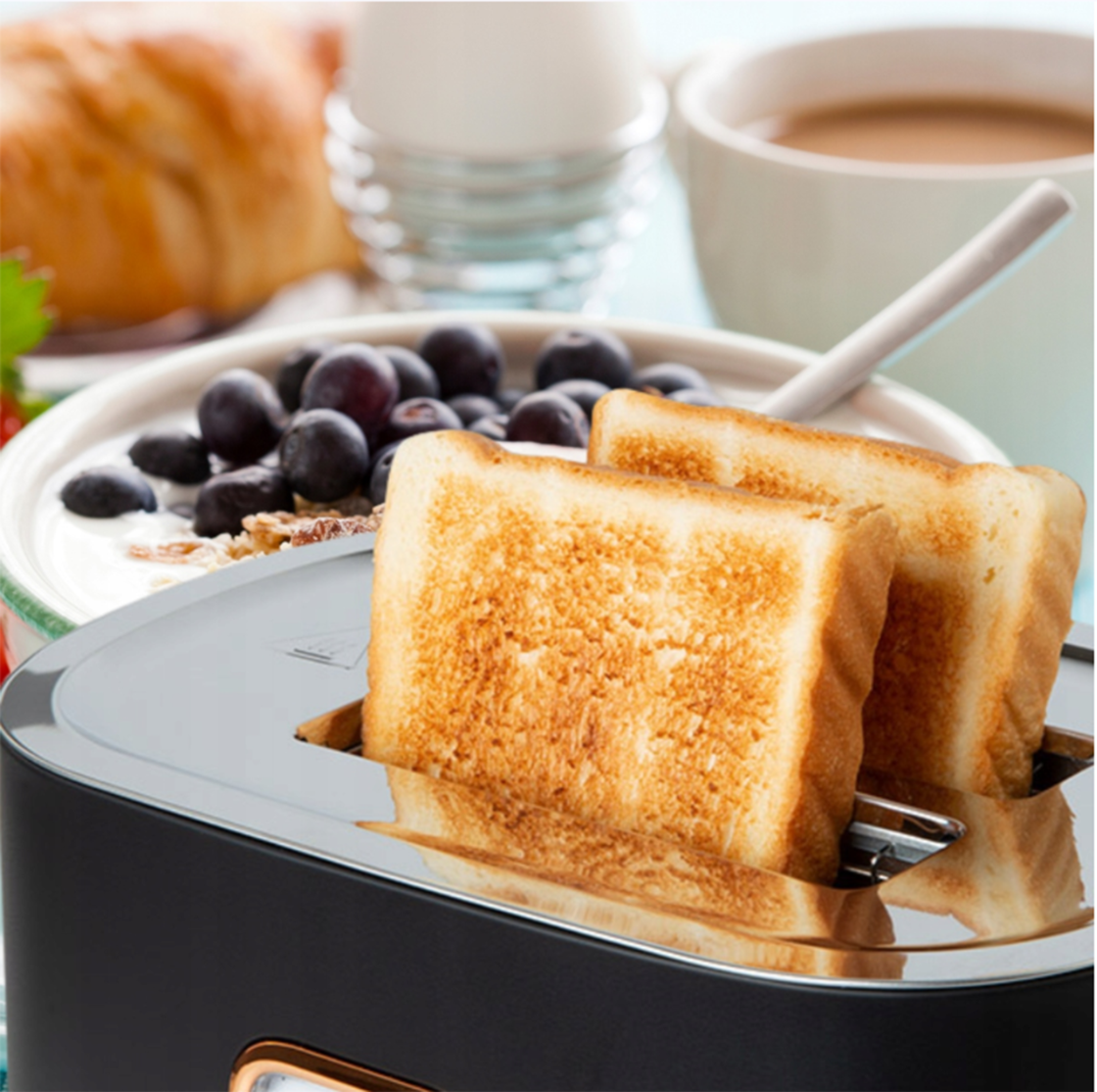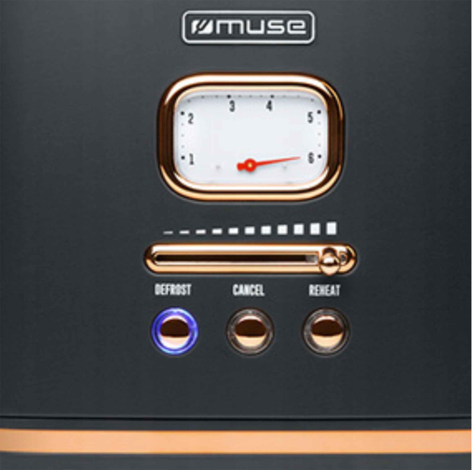Toster M-130BC ma nieprzeciętny Retro design, czarny, matowy kolor i złote dodatki to czysta elegancja ale wnętrze tego urządzenia to nowoczesne rozwiązania: 6 poziomów brązowienia, podświetlane przyciski: anulowanie, rozmrażanie i podgrzewanie, schowek na kabel, tworzą urządzenie na miarę XXIw.
