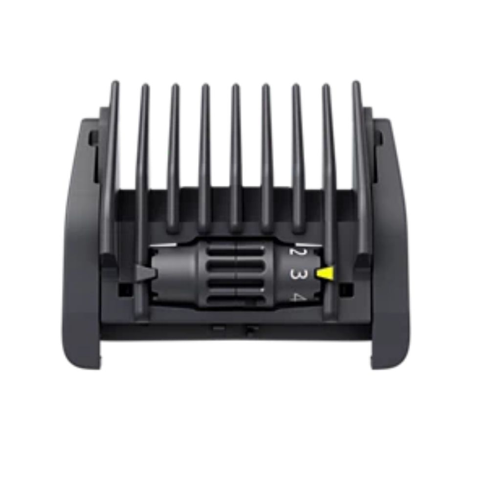 W zestawie znajduje się 5‑pozycyjny grzebień, który umożliwia przycinanie zarostu na długość do 5 mm. Ostrze umożliwia precyzyjne kontury oraz golenie w obu kierunkach, co ułatwia stylizację