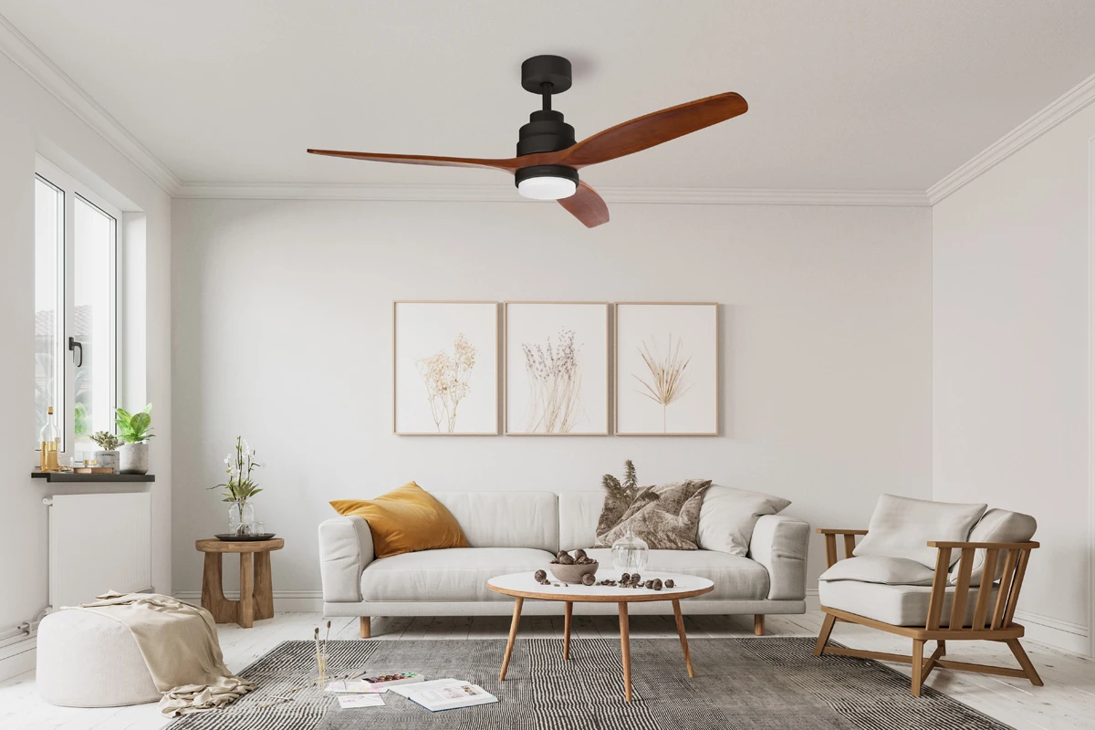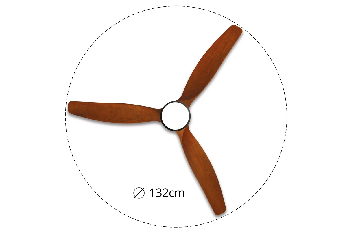 Z dużą średnicą 132 cm i trzema łopatami z drewna dębowego (czarny wykończenie), wentylator zapewnia skuteczną cyrkulację powietrza i elegancki wygląd, doskonały do wnętrz w stylu loftowym, minimalistycznym i klasycznym