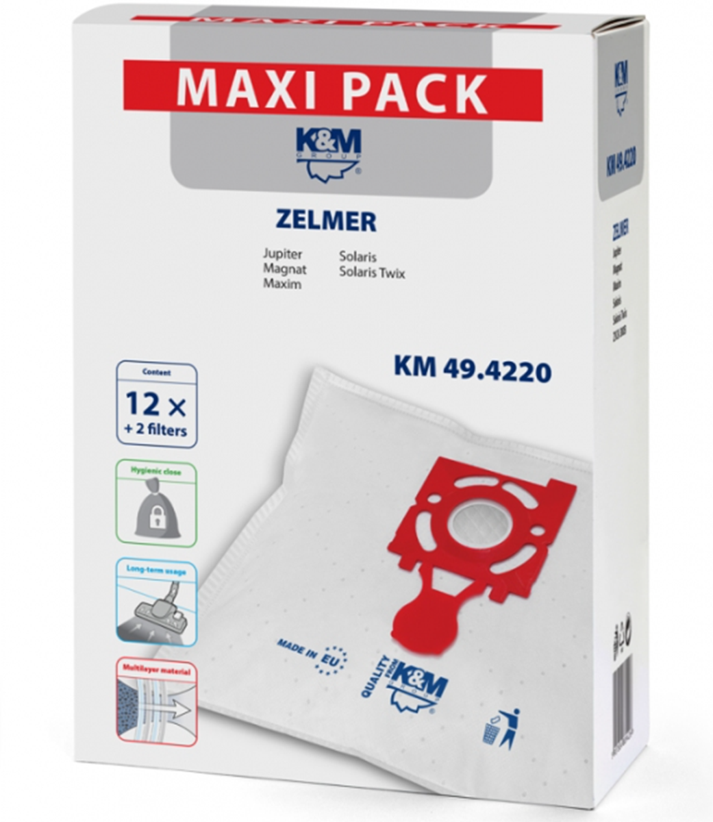 Przedstawiamy zestaw 12 wytrzymałych worków syntetycznych marki K&M, model 49.4220, w kolorze czerwonym, przeznaczonych do odkurzaczy Zelmer. Dodatkowo w komplecie znajdują się 2 filtry, które zapewniają skuteczną filtrację i ochronę silnika odkurzacza.